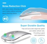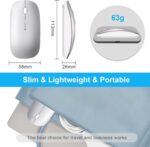 - [Rechargeable Optical Positioning Mouse – Indicator Light] Built-in durable 800mAh lithium polymer rechargeable battery, when the mouse is charging. The indicator light is on and emits red light, the mouse is fully charged, the indicator light is off. Turn on the mouse Bluetooth mode. The bottom cursor shows blue, turn on wireless 2.4G mode. The bottom cursor shows green. The mouse automatically enters sleep mode when idle to save power, double click the mouse to wake up the mouse. USB-C charging cable is included in the packing list, convenient for charging and carrying.