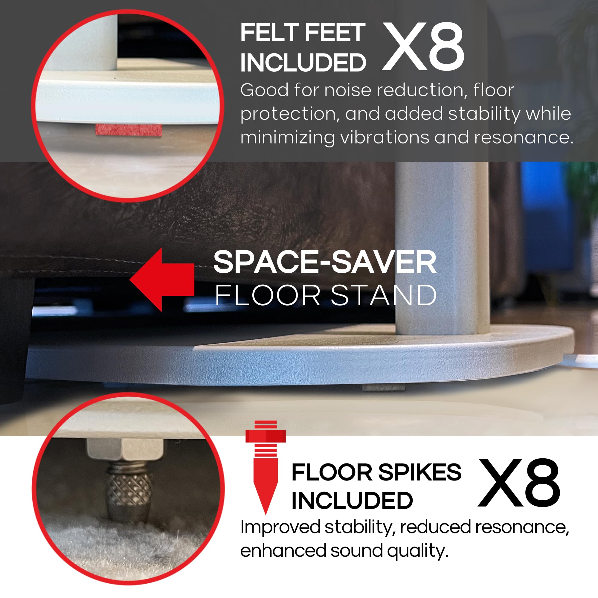 - VERSATILE FLOOR COMPATIBILITY: Tailored to suit any flooring type, our stands come supplied with both felt feet and adjustable steel spikes, ensuring stable placement whether on carpeted or hard floors. This adaptability enhances both stability and audio performance, offering flexibility in your audio setup choices. Included in this TWIN PACK are two floor stands along with the necessary hardware kits. Please note, the speakers are not included with the stands.