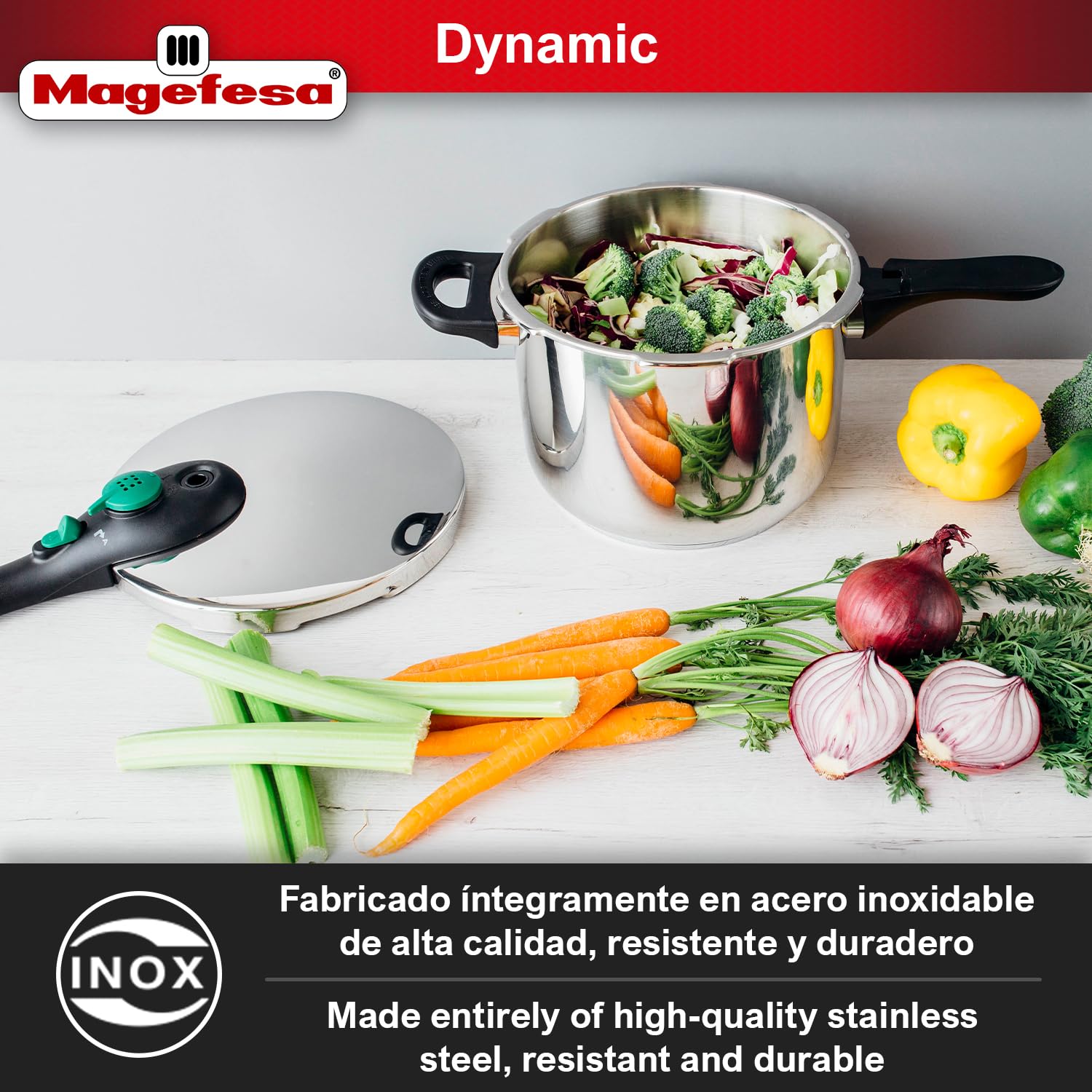- SUPER FAST: The MAGEFESA DYNAMIC pressure cooker offers super fast cooking with a very simple operation and a patented opening system to close the lid with minimal effort and maximum safety. Preserves more vitamins, minerals, and flavors.