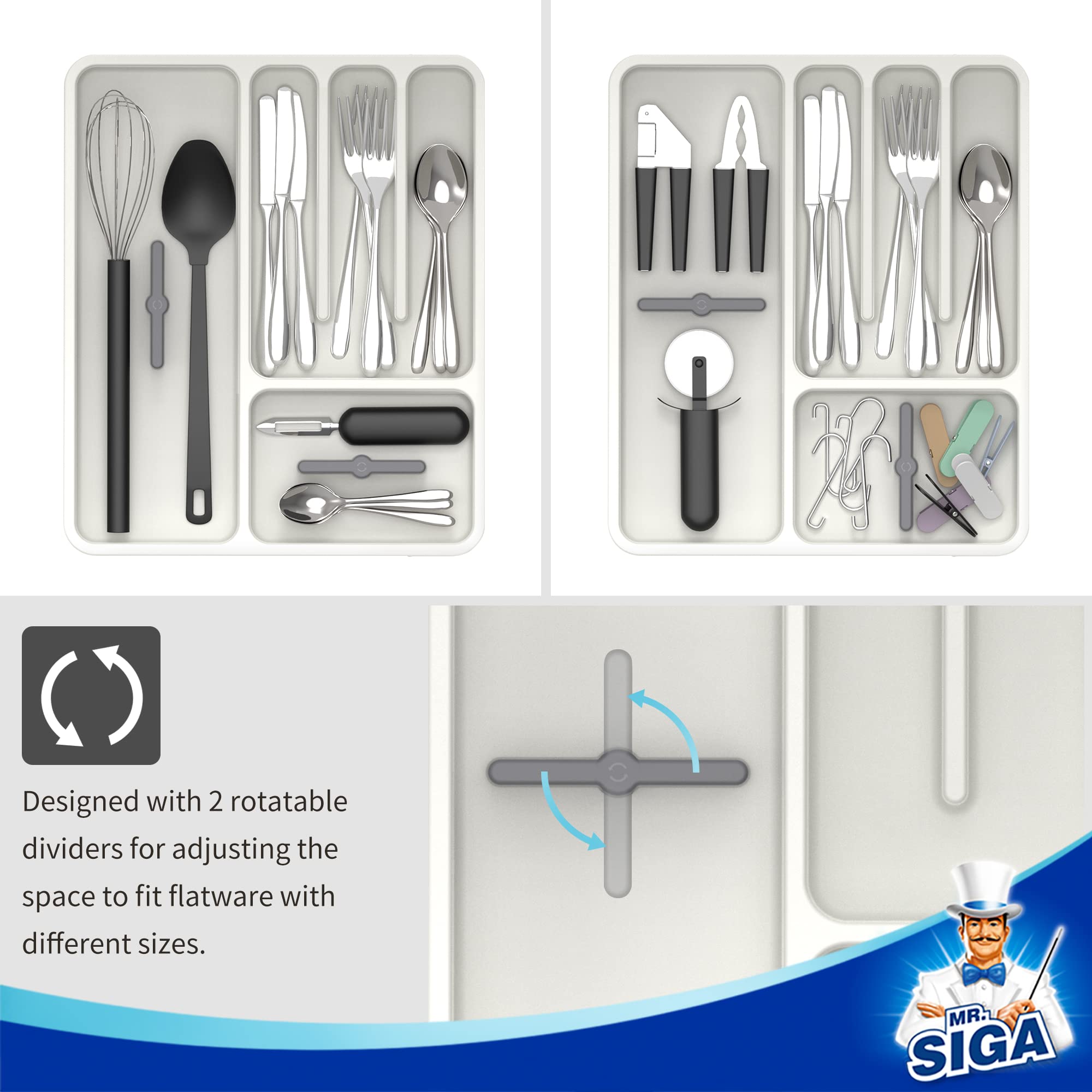 - STURDY CONSTRUCTION: MR.SIGA expandable flatware organizer is made of durable plastic which ensures it’s long lasting. Comes with two pieces, one piece with 7 compartments and another expandable panel on the right for storing more silverware, cutlery, and kitchen utensils.