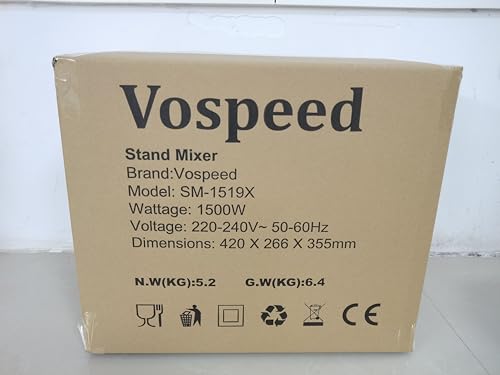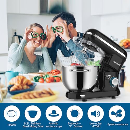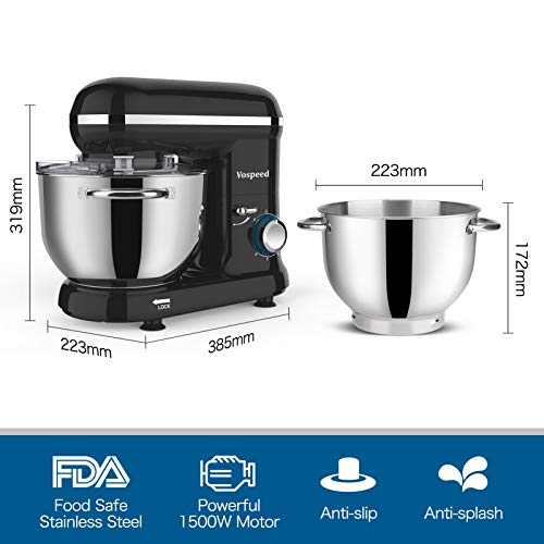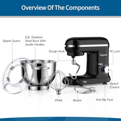 - 【Excellent Standing Mixer】: Powerful 1500W Motor with 6 Adjustable Speeds & a planetary stirring system, 6.2L stainless steel mixing bowl. This dough mixer can ensure tailor mixing effortlessly and thoroughly for a variety of food, ranging from pasta to ice cream, egg whites to bread dough. Vospeed electric mixer is a perfect gift idea for your family and friends.