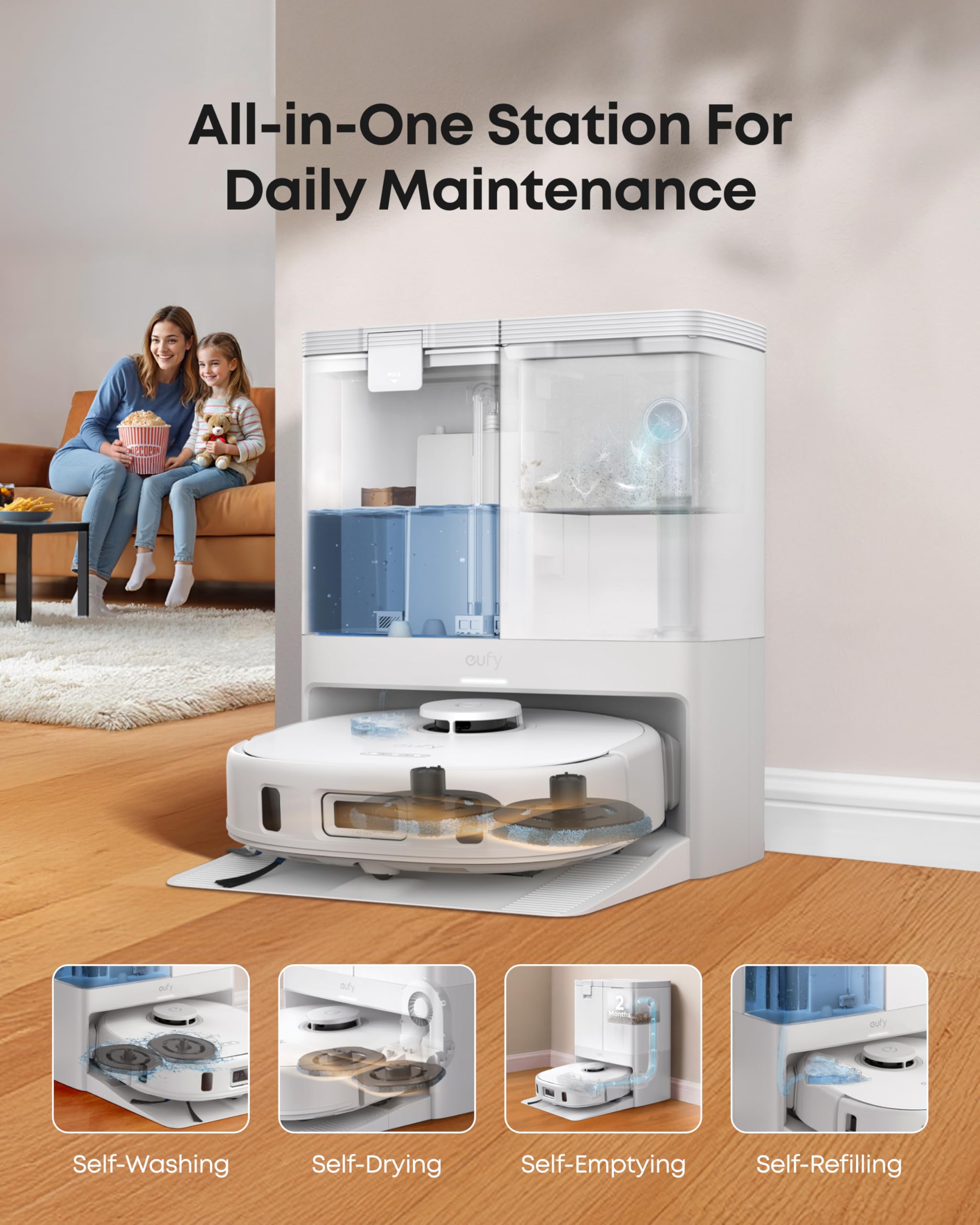 • [𝐀𝐥𝐥-𝐢𝐧-𝐎𝐧𝐞 𝐒𝐭𝐚𝐭𝐢𝐨𝐧 𝐟𝐨𝐫 𝐇𝐚𝐧𝐝𝐬-𝐅𝐫𝐞𝐞 𝐂𝐥𝐞𝐚𝐧𝐢𝐧𝐠] X10 Pro Omni’s mop pads are washed using clean water, then dried with 45°C (113°F) heated air. Its dust bin is emptied into the station’s 2.5L dust bag, which only needs to be replaced every 2 months. The 3L clean water tank provides enough water to mop a 1,500-2,000 sq ft (150 sq m) home 2-3 times.