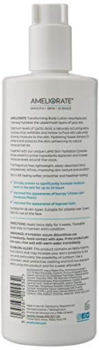 Details: AMELIORATE transforming body lotion fragrance free resurfaces and intensely hydrates the uppermost layers of your skin. Optimum levels of lactic acid, a naturally occurring alpha Hydroxy acid, exfoliate and renew surface skin cells whilst drawing moisture to the skin. Hydrating sweet almond oil softens and protects the skin, enhancing its natural moisture barrier. Together with our unique Lah6 skin hydration complex, these powerful active ingredients replenish and increase moisture levels around-the-clock. This lightweight, fragrance free, easily-absorbed lotion progressively refines, improving skin texture and condition. Skin is left feeling