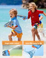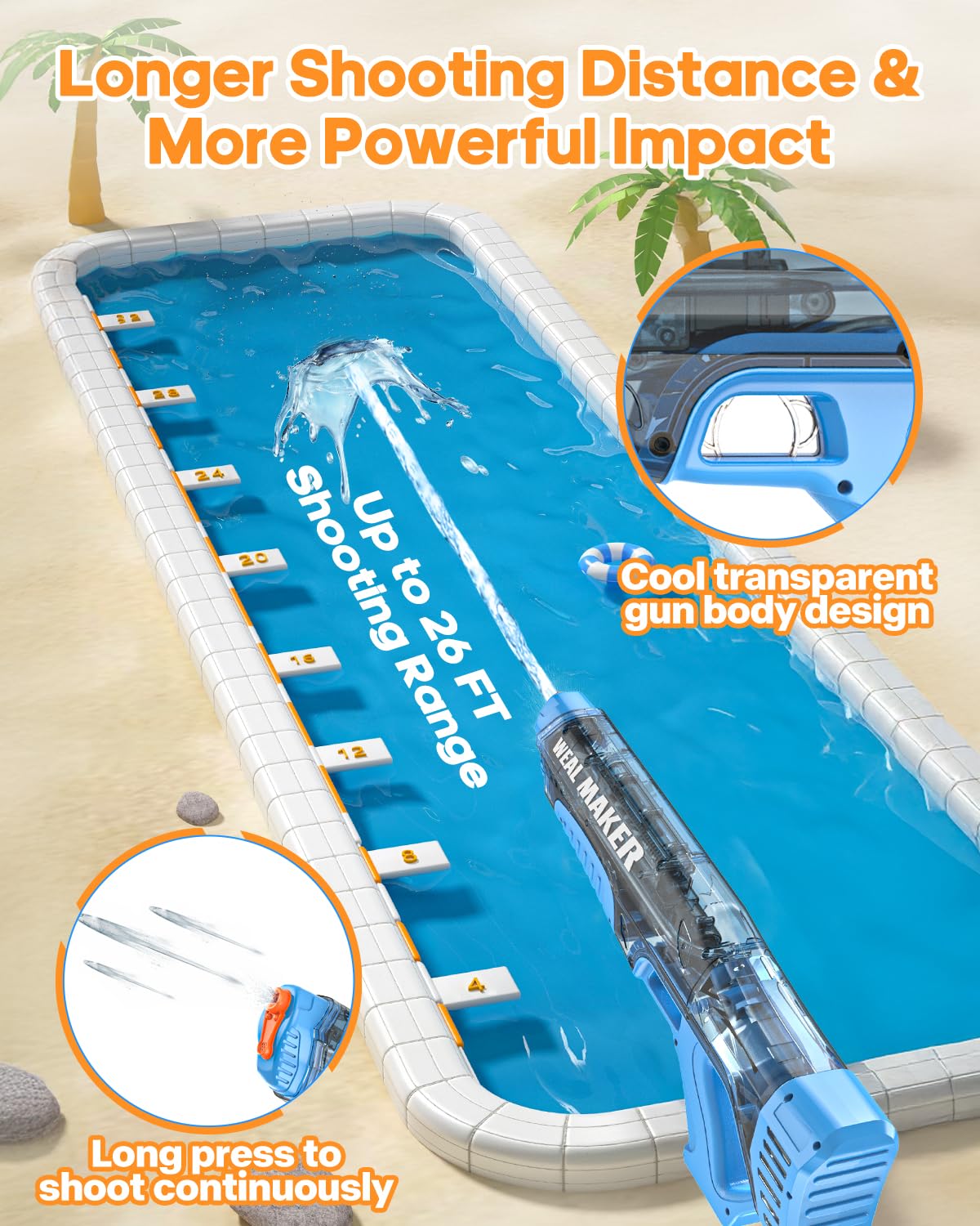 • Large water output, Ultra-Long Range, more powerful:We have updated the water outlet design, so that the water output is larger and more impactful. The advanced electric motor makes the shooting more powerful, this electric water gun can shoot water up to 30 feet away, giving you the upper hand in water battles.